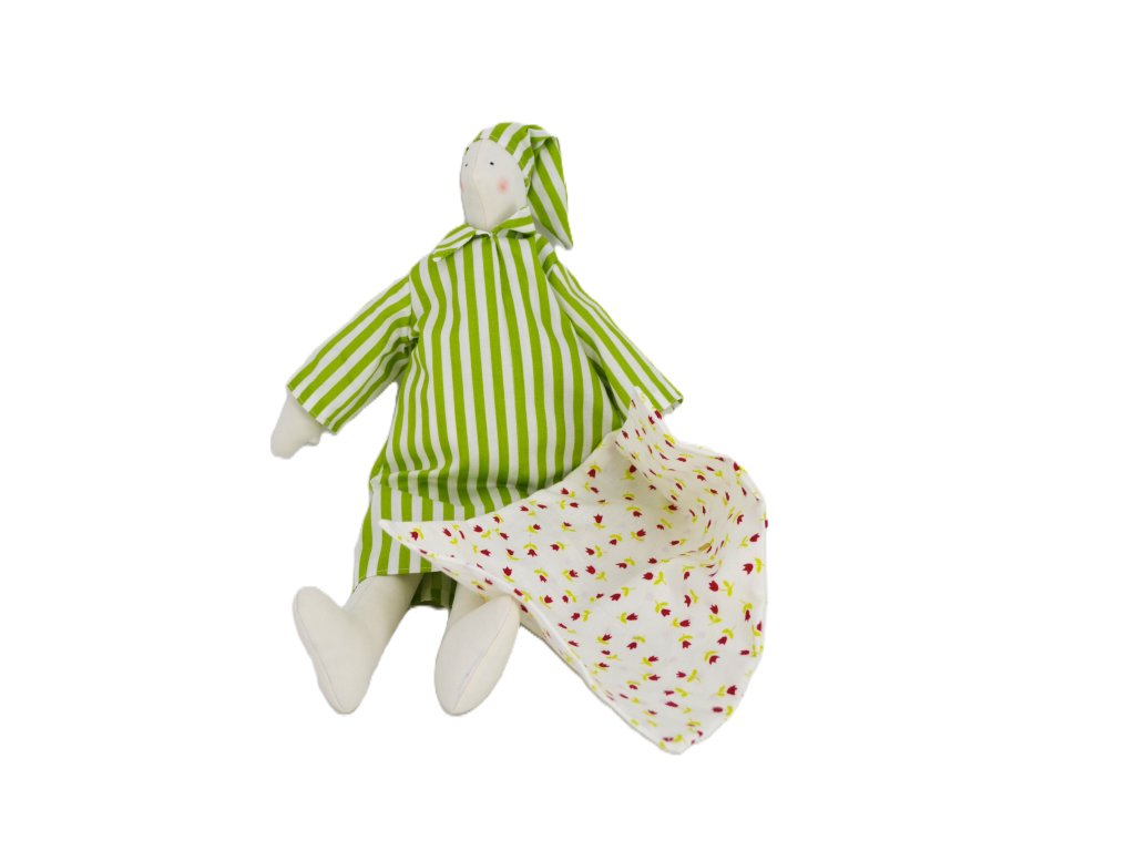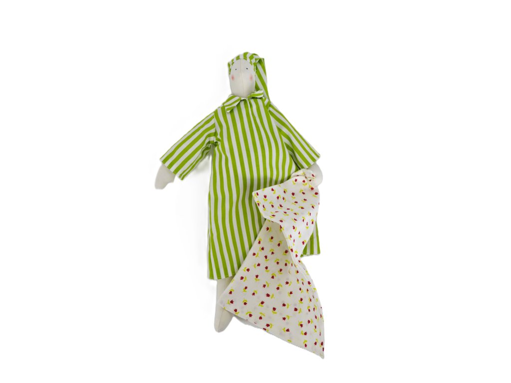 Kouzelný hajánek z naší krejčovské dílny, pečlivě ušitý s důrazem na detail. Postavička měří přibližně 35 cm a má na sobě noční košili s čepičkou.