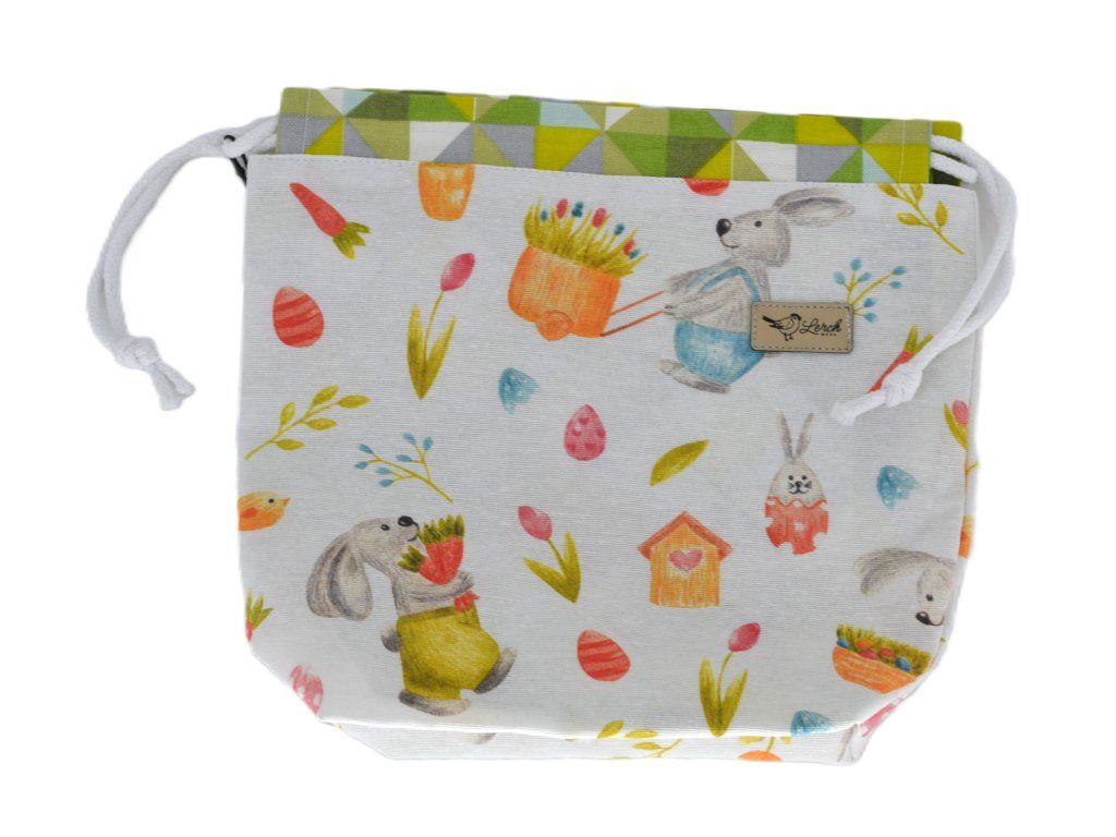 Ručně šitá projektová taška z bavlny s potiskem – s podšívkou a stahováním na šňůrky