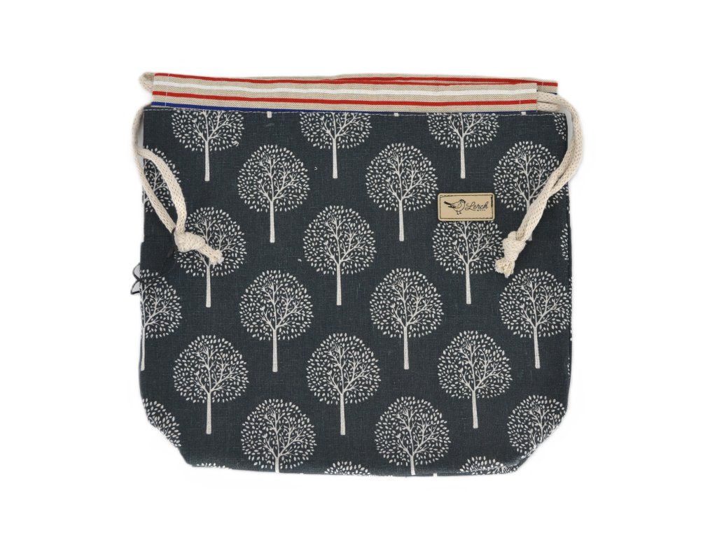 Ručně šitá projektová taška z bavlny s potiskem – s podšívkou a stahováním na šňůrky