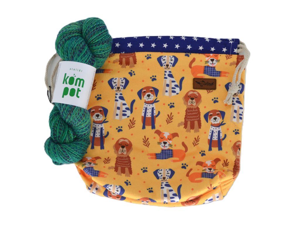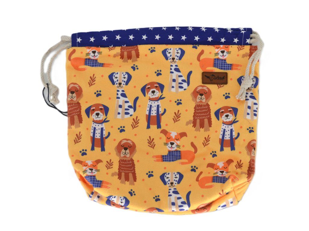 Ručně šitá projektová taška z bavlny s potiskem – s podšívkou a stahováním na šňůrky