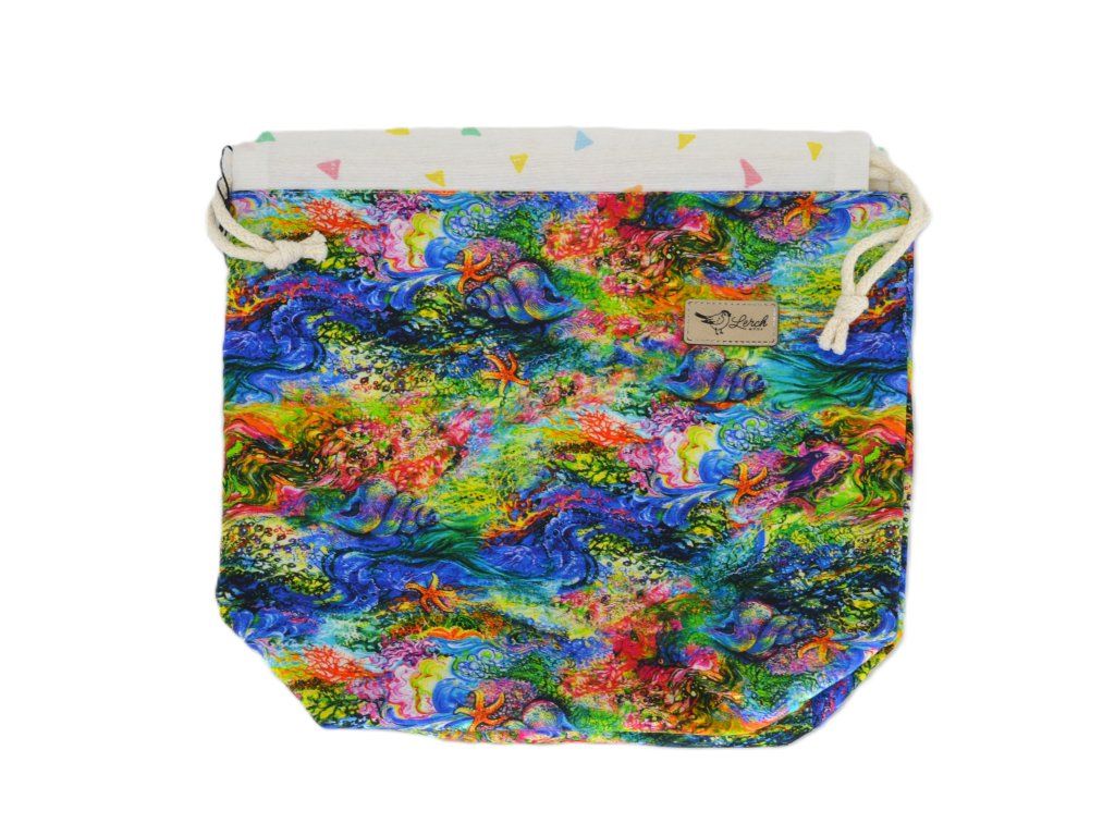Ručně šitá projektová taška z bavlny s potiskem – s podšívkou a stahováním na šňůrky