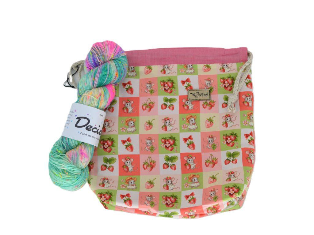 Ručně šitá projektová taška z bavlny s potiskem – s podšívkou a stahováním na šňůrky