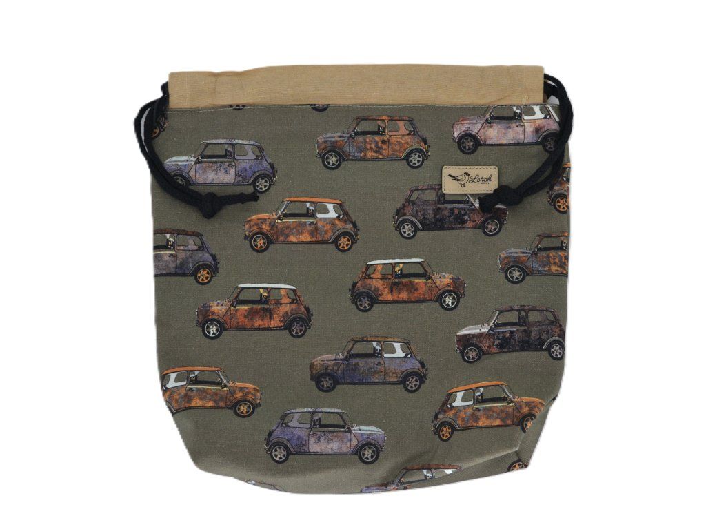 Ručně šitá projektová taška z bavlny s potiskem – s podšívkou a stahováním na šňůrky