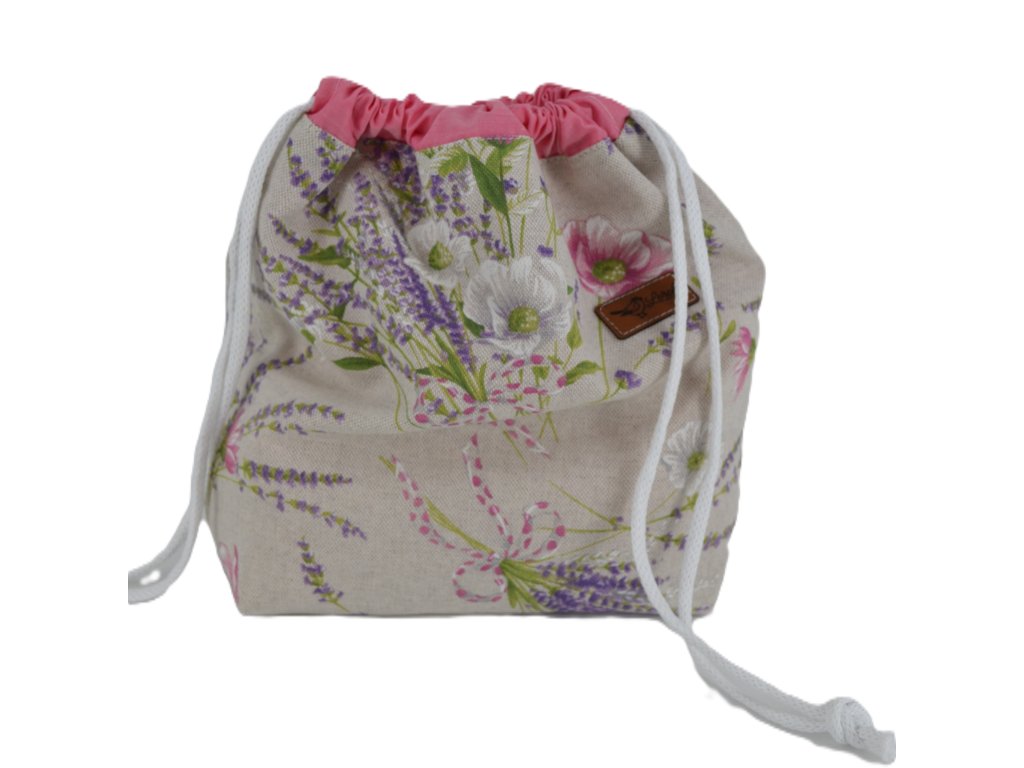 Ručně šitá projektová taška z bavlny s potiskem – s podšívkou a stahováním na šňůrky