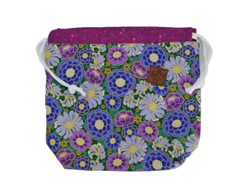 Ručně šitá projektová taška z bavlny s potiskem – s podšívkou a stahováním na šňůrky