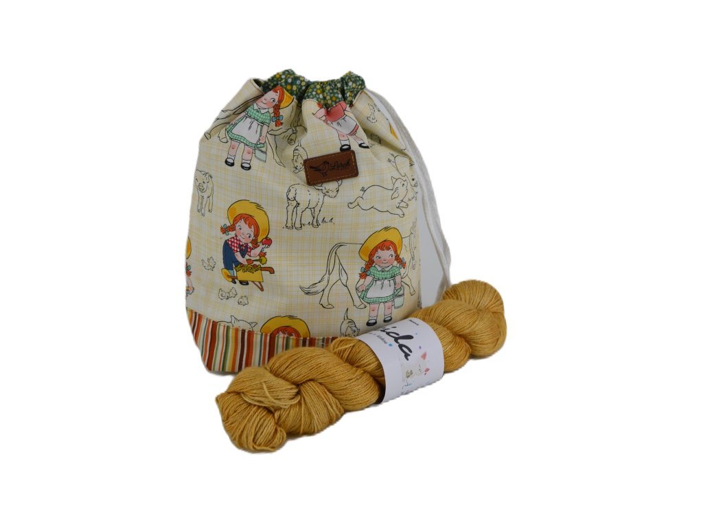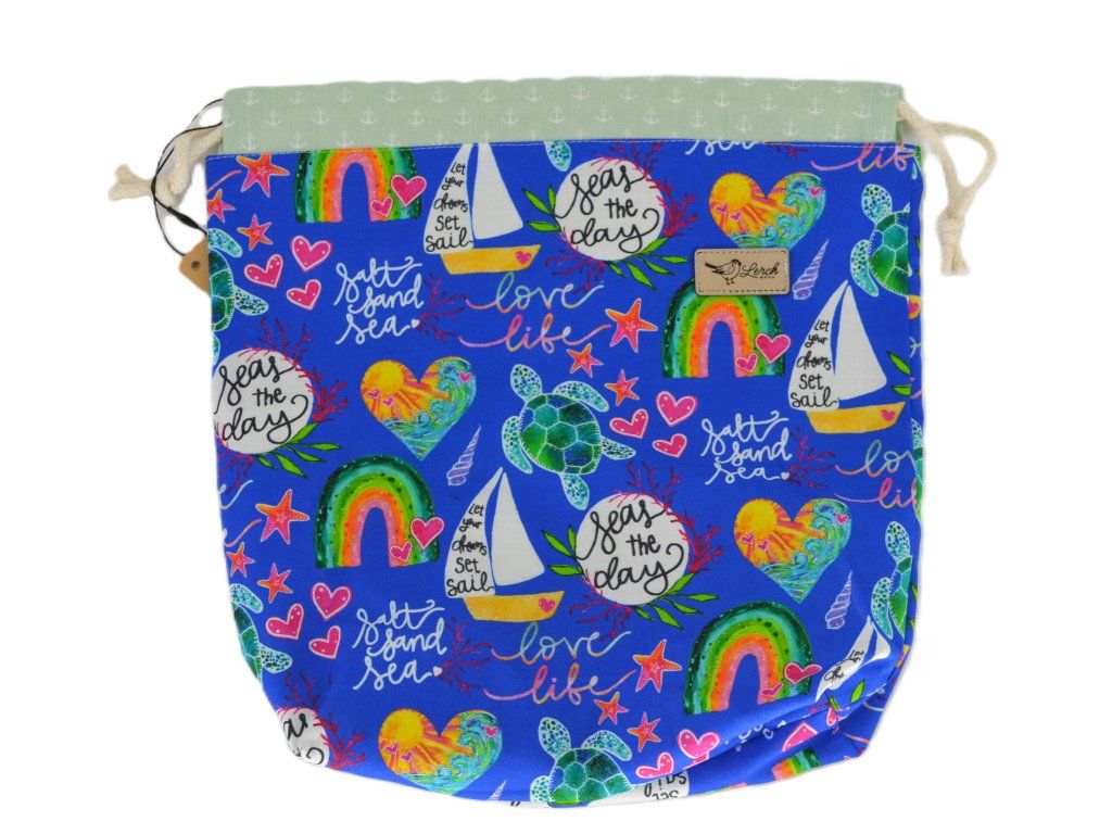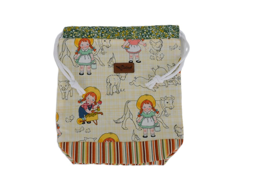 Ručně šitá projektová taška z bavlny s potiskem – s podšívkou a stahováním na šňůrky